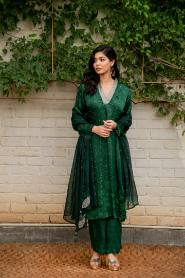 Emerald Green Embroidered Satin Kurta Set With Dupatta