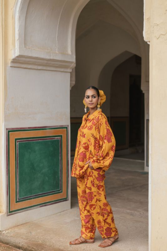 NAAV's classic placement floral orange set is designed with a structured shirt collar, button-down front,...