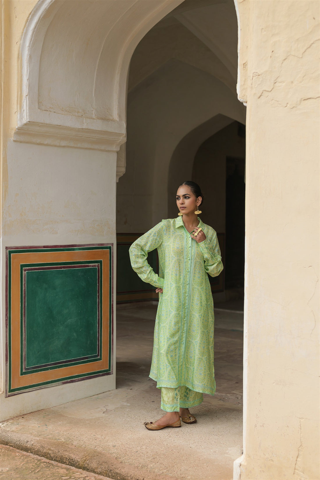 Vaanya Set - Light Green Print Silk Blend Relaxed Fit Fabric Buttons Kurta & Pant