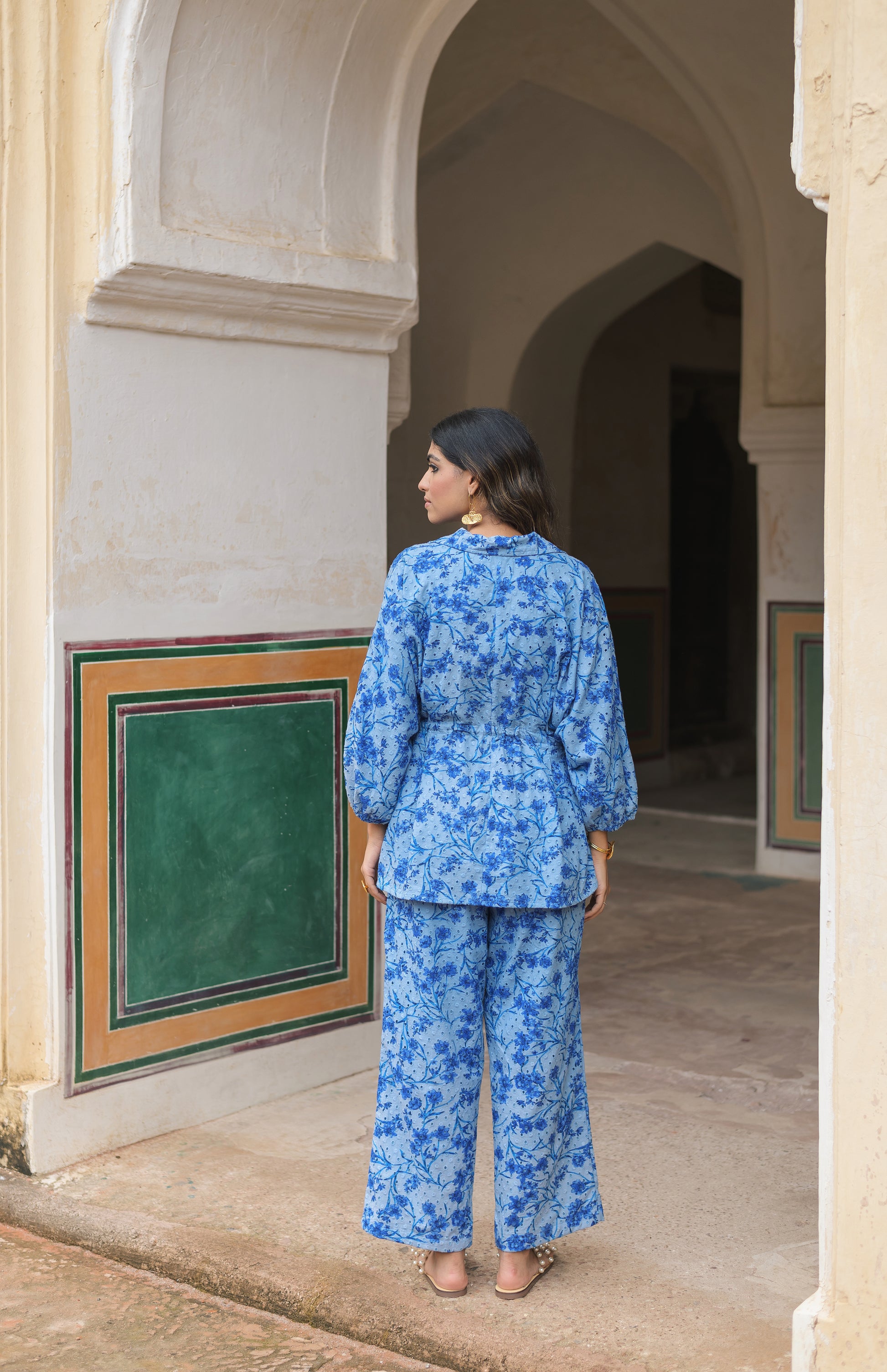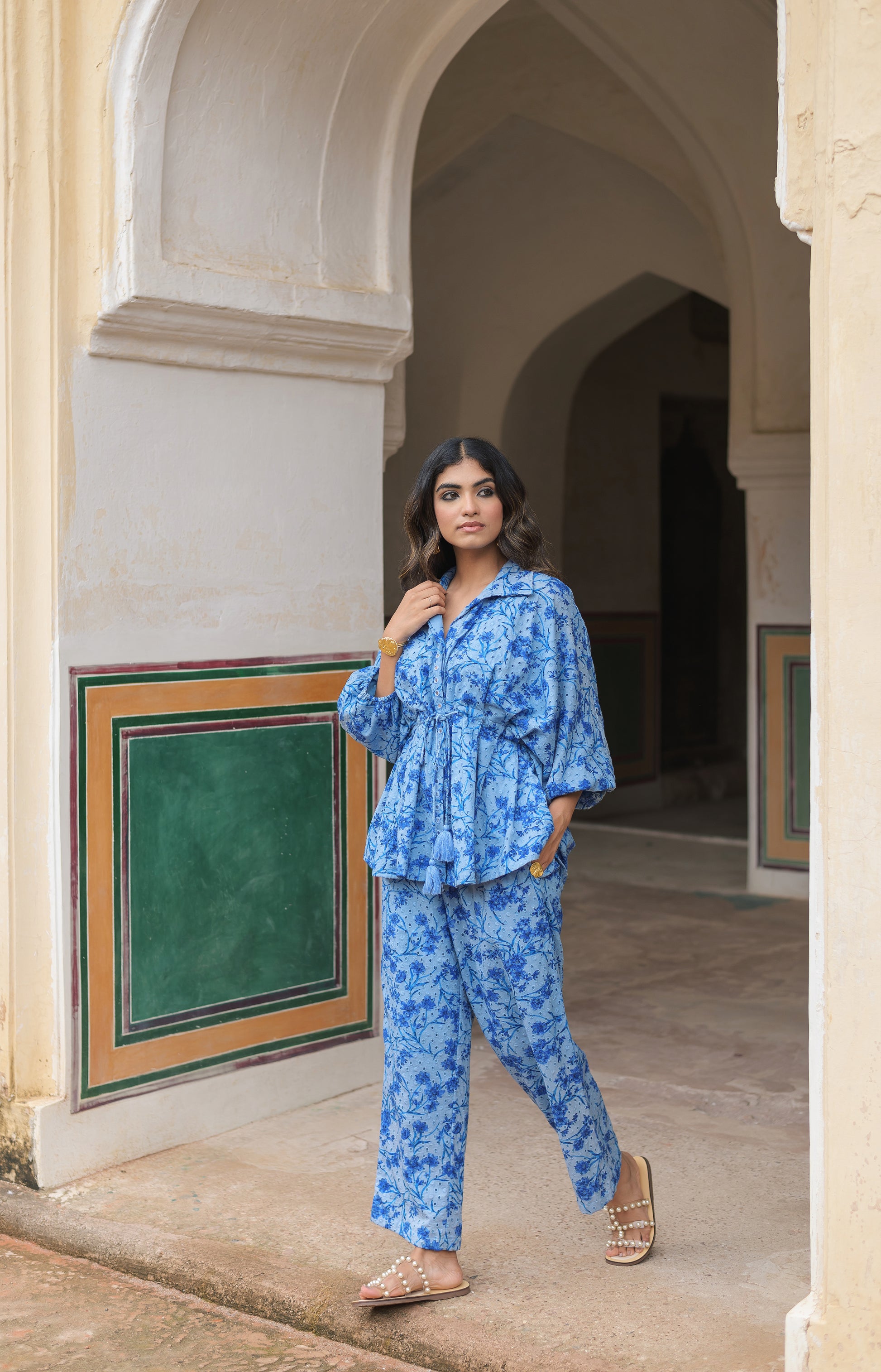 The Azure Set by Naav is a two-piece co-ord crafted in soft cotton with Schiffli embroidery all over in a light base and cobalt floral print. The collared button-down shirt features 3/4th sleeves, front pockets, and a drawstring tie-up waist finished with tassels. The shirt also has mirror embroidery on the button placket. It is paired with matching wide-leg pants, offering comfort and ease for everyday wear.