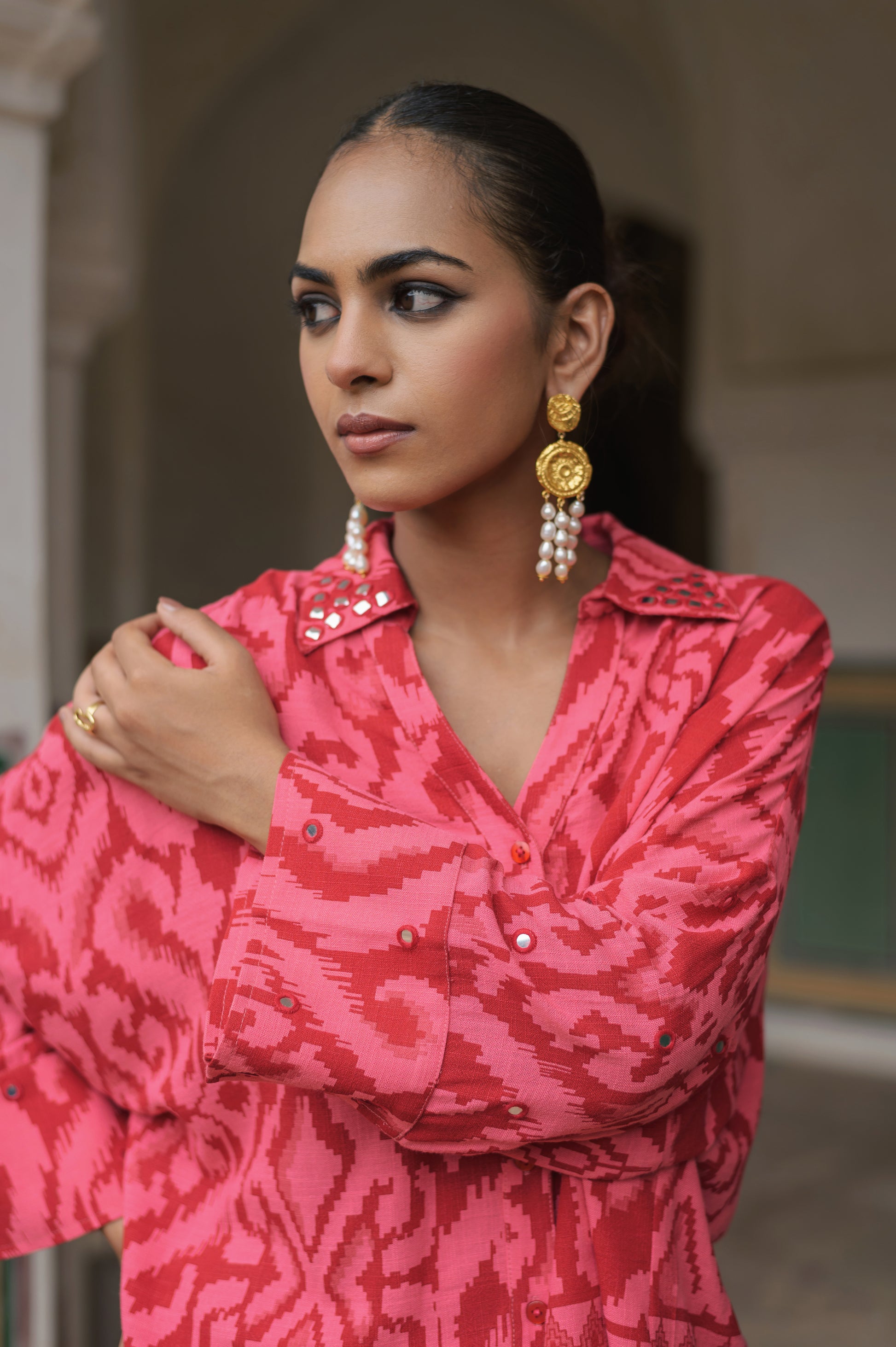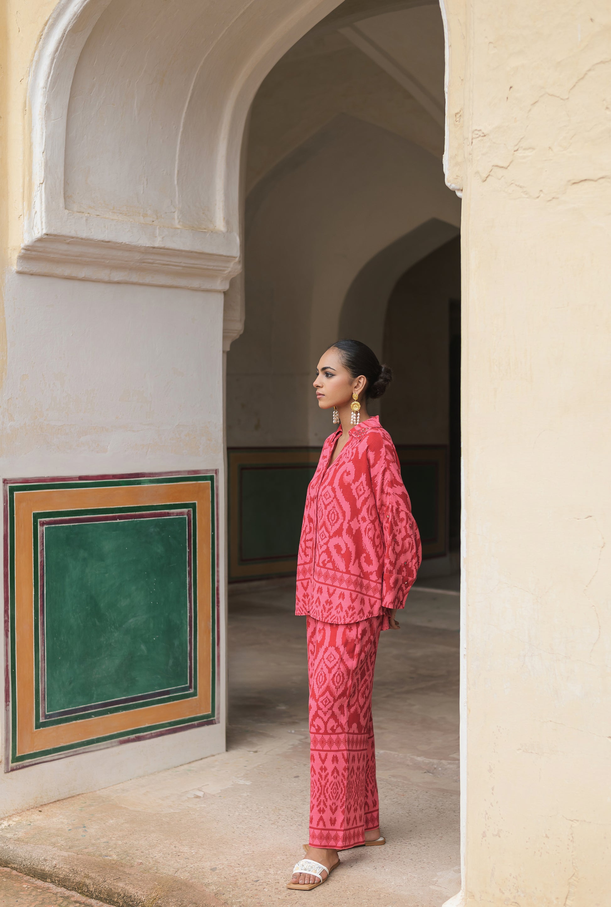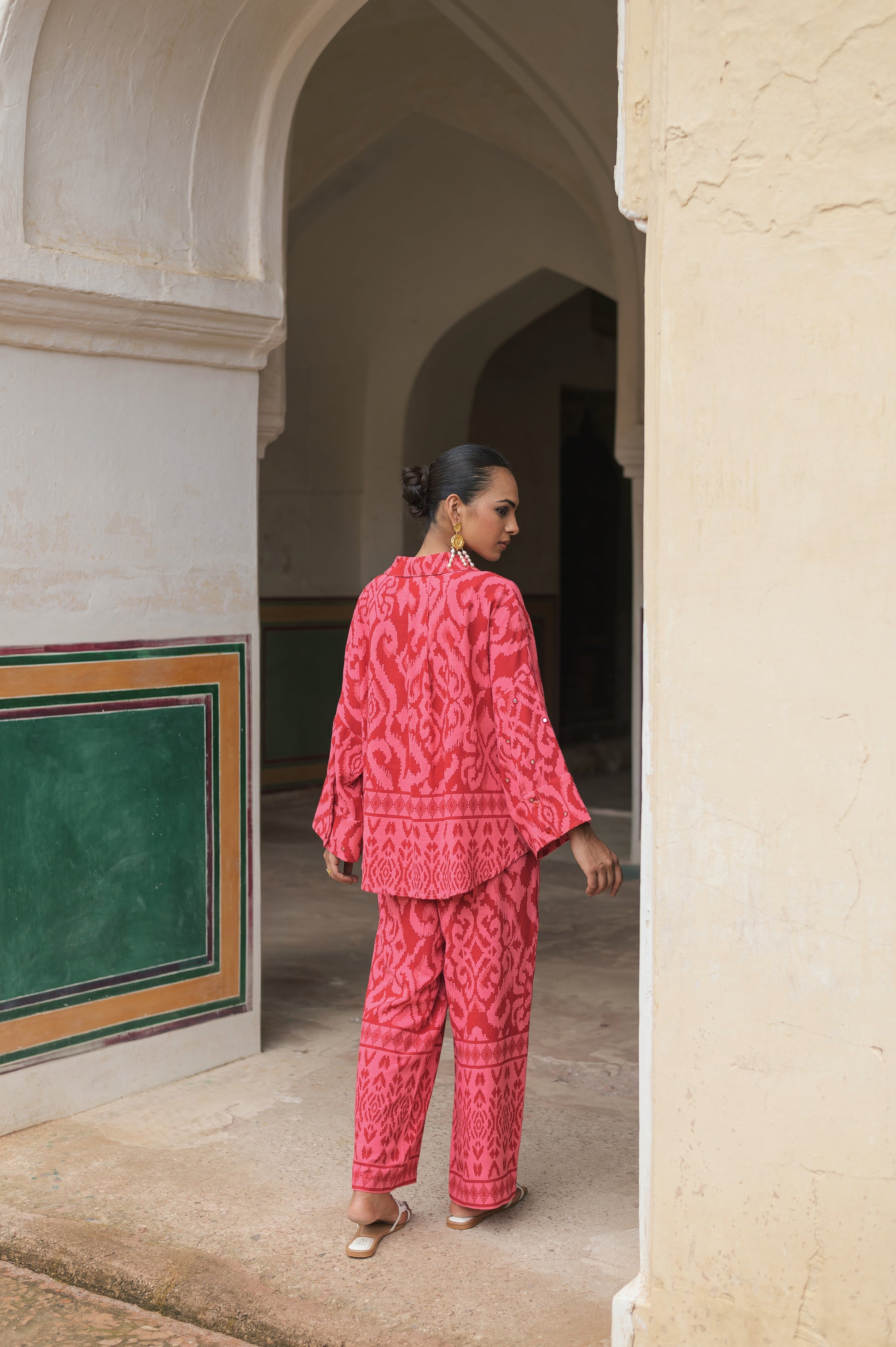The Bloom Set by Naav is a two-piece co-ord in breathable cotton, designed on a bright pink base with an abstract ikat-inspired print. The collared button-down shirt features full sleeves, front buttons, and subtle mirror embroidery on the collar and sleeves. Paired with straight-fit pants in the same print, this set balances comfort with polish, making it a versatile choice from day to evening.