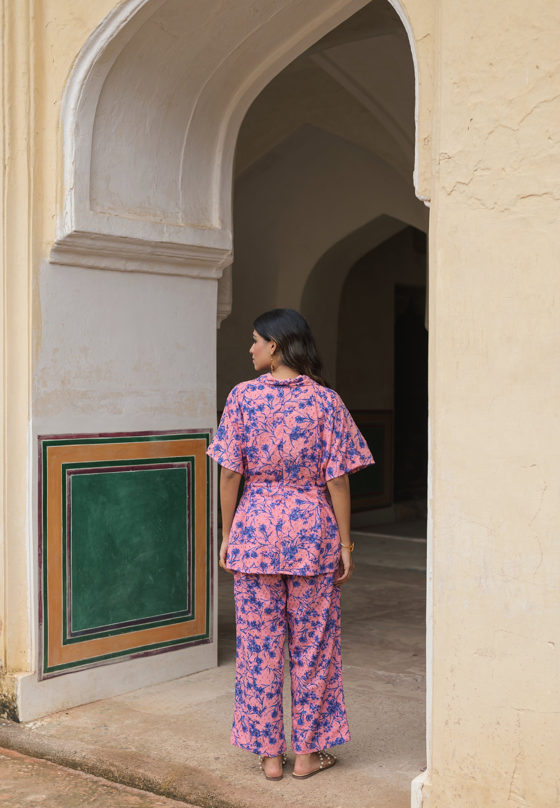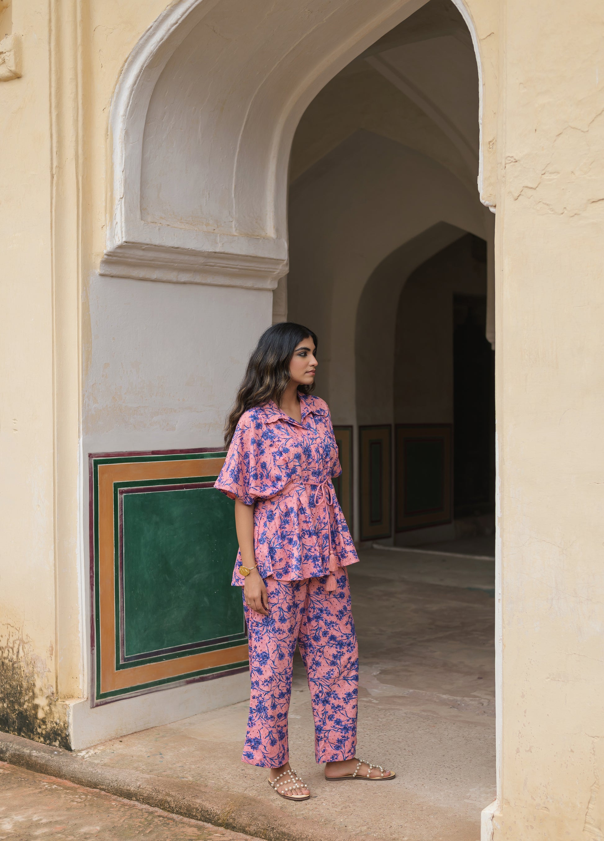 The Blush Set by Naav is a two-piece co-ord crafted in soft cotton with Schiffli embroidery all over in a blush pink base and cobalt floral print. The collared button-down shirt features short sleeves, front pockets, and a drawstring tie-up waist finished with tassels. The shirt also has a scallop detail on the collar. It is paired with matching wide-leg pants, offering comfort and ease for everyday wear.