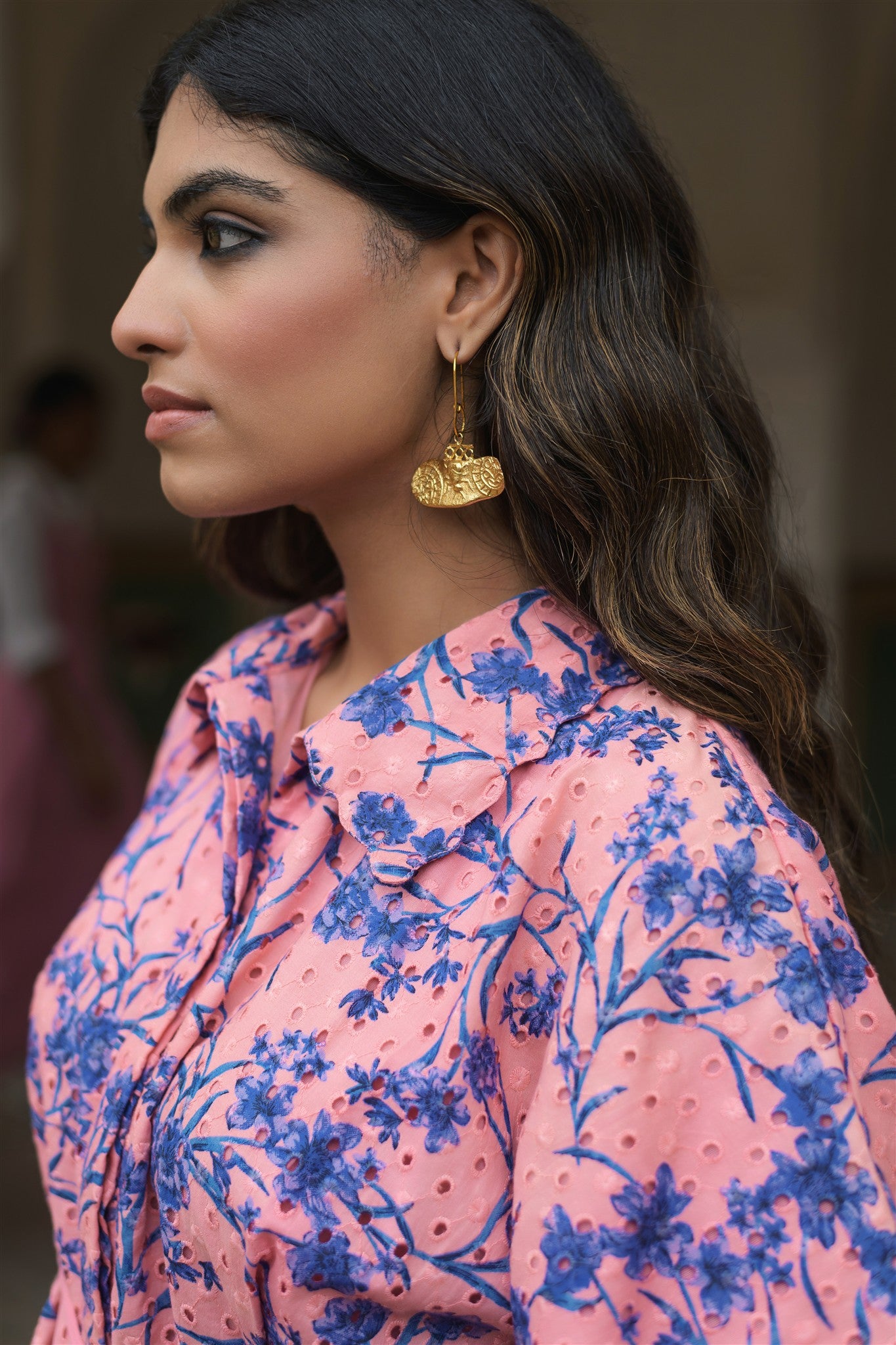 The Blush Set by Naav is a two-piece co-ord crafted from soft cotton with Schiffli embroidery throughout in a blush pink base and cobalt floral print. The collared button-down shirt features short sleeves, front pockets, and a drawstring tie-up waist finished with tassels. The shirt also has a scallop detail on the collar. It is paired with matching wide-leg pants, offering comfort and ease for everyday wear.
