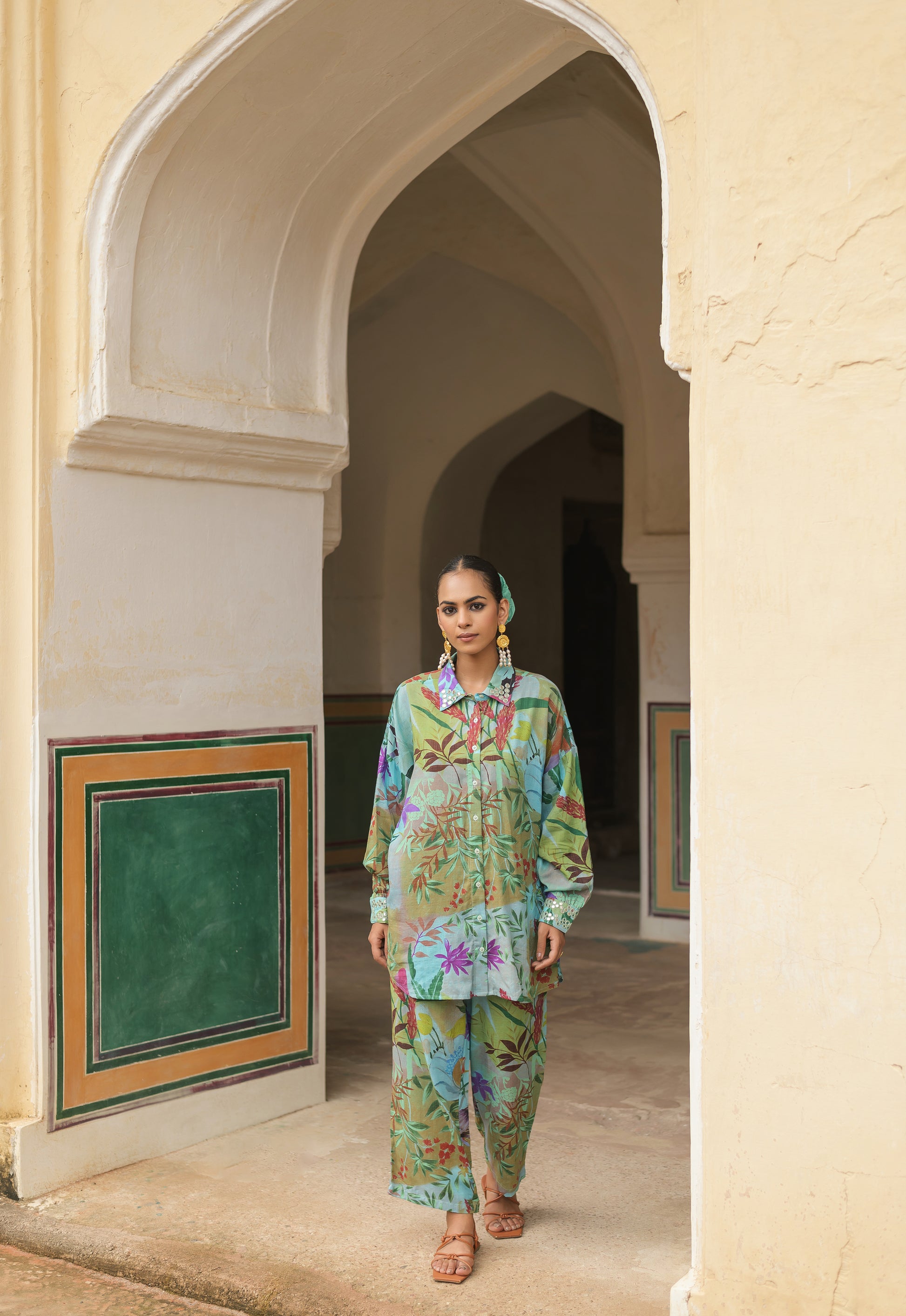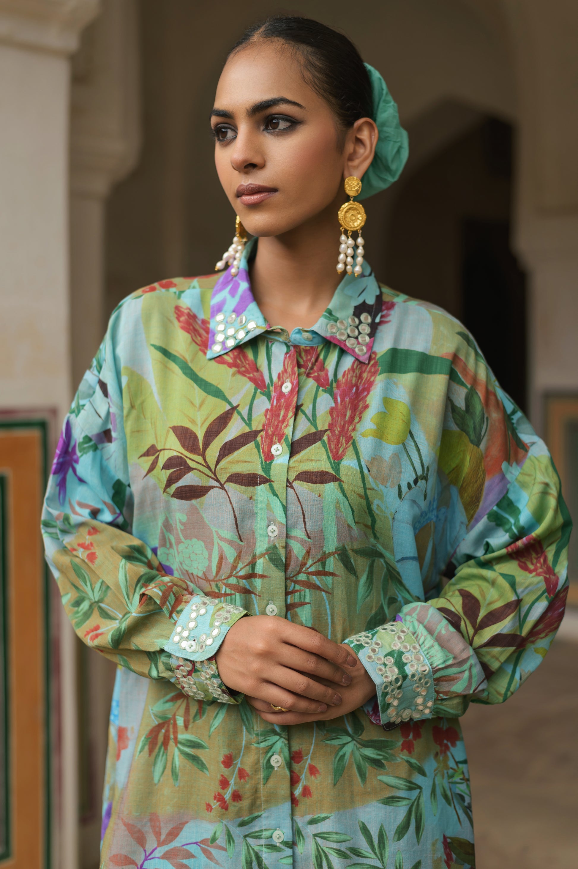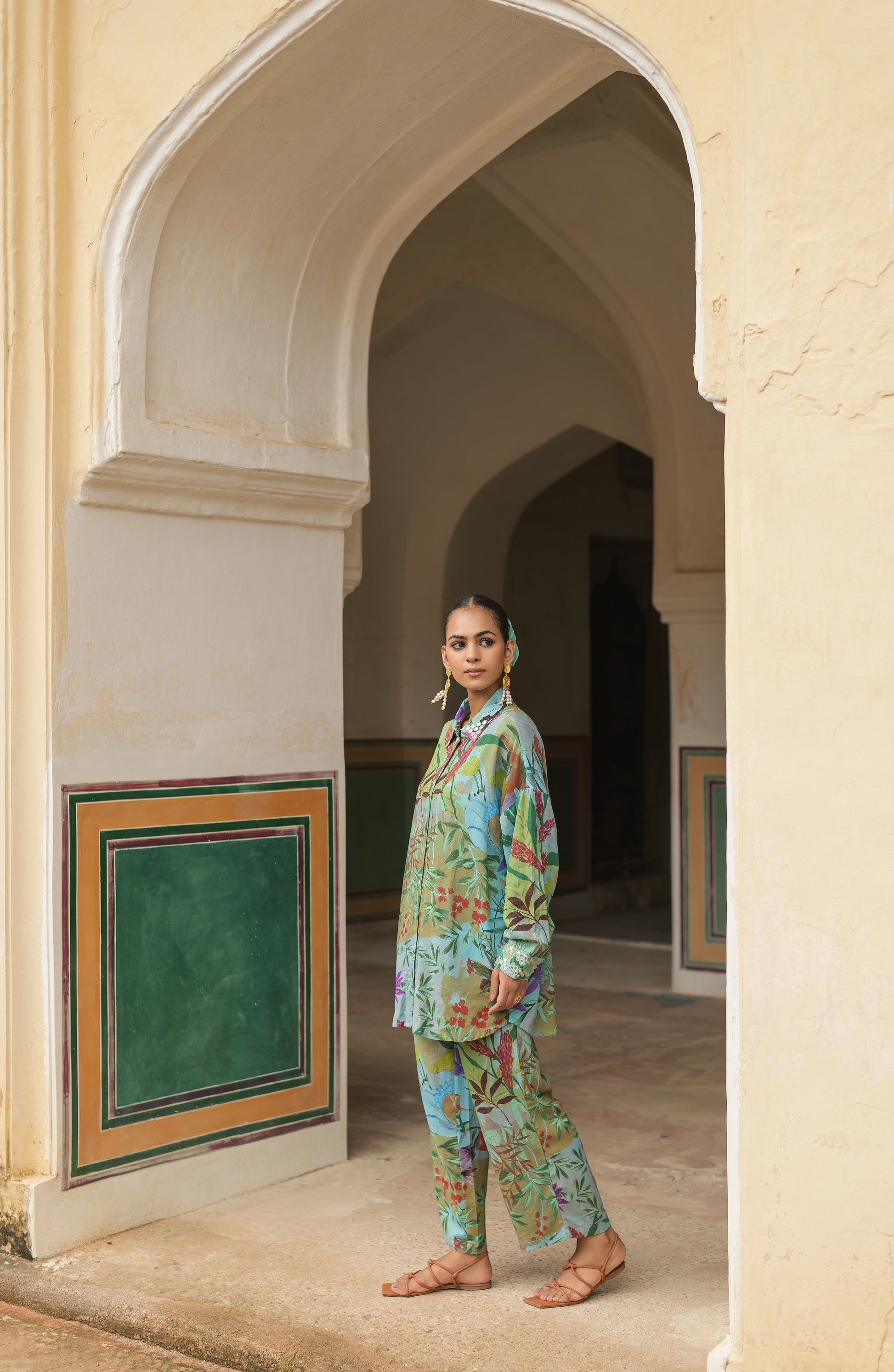 The Moss Set by Naav is a two-piece co-ord in lightweight cotton, featuring a refreshing blue base with abstract floral prints. The collared shirt comes with full sleeves, front buttons, and delicate mirror embroidery on the collar and cuffs. Paired with matching straight-fit pants, this set offers comfort with a polished finish — an easy choice from day to evening.