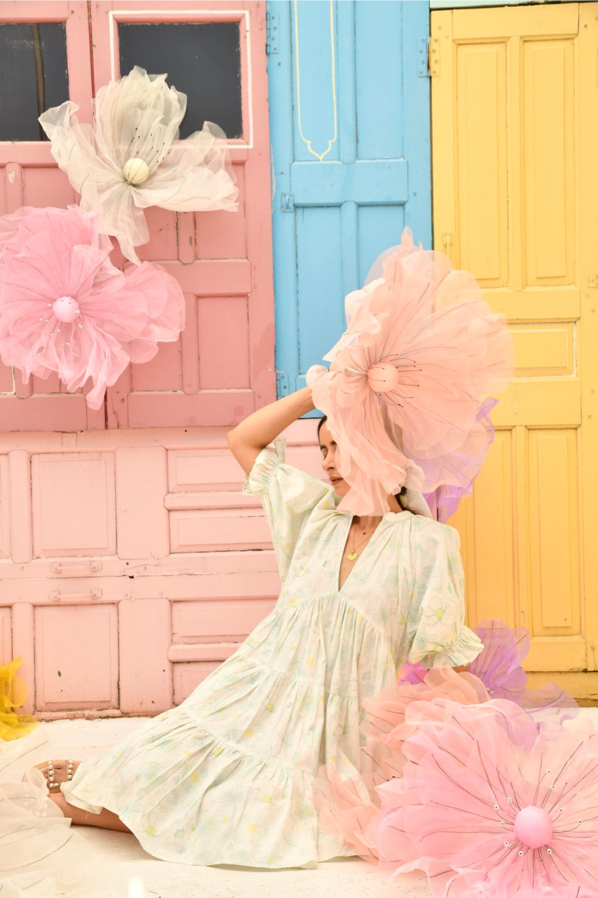 NAAV’s Ruby Dress is a statement midi-length dress with a voluminous silhouette and structured elegance. Featuring a soft blue print and kantha hand embroidery around the deep V-neckline, this dress blends artisanal charm with modern sophistication. Elasticated sleeves add a touch of ease, making it perfect for warm summer days. Crafted from 100% poplin, the fabric is structured, breathable, and comfortable.