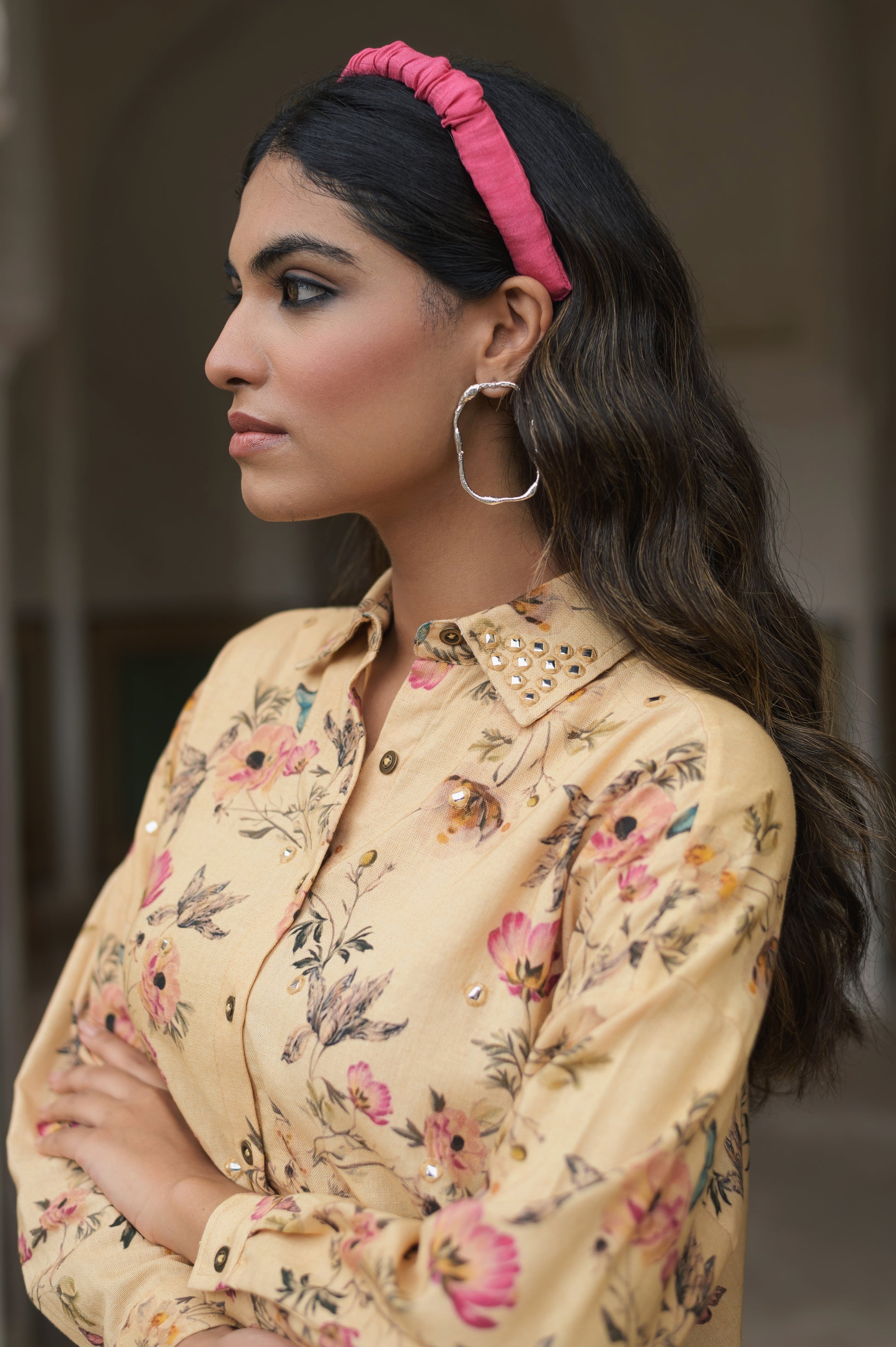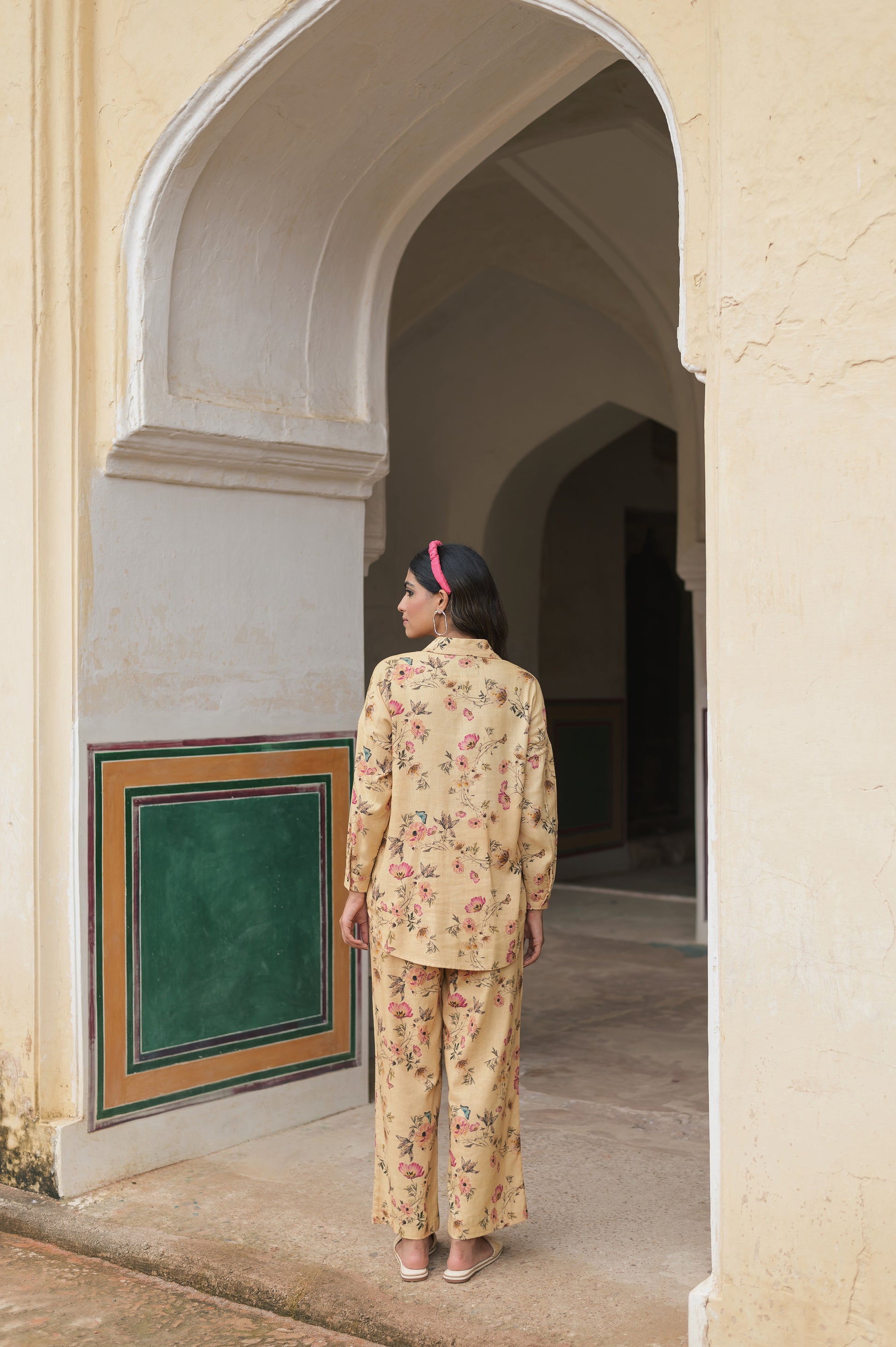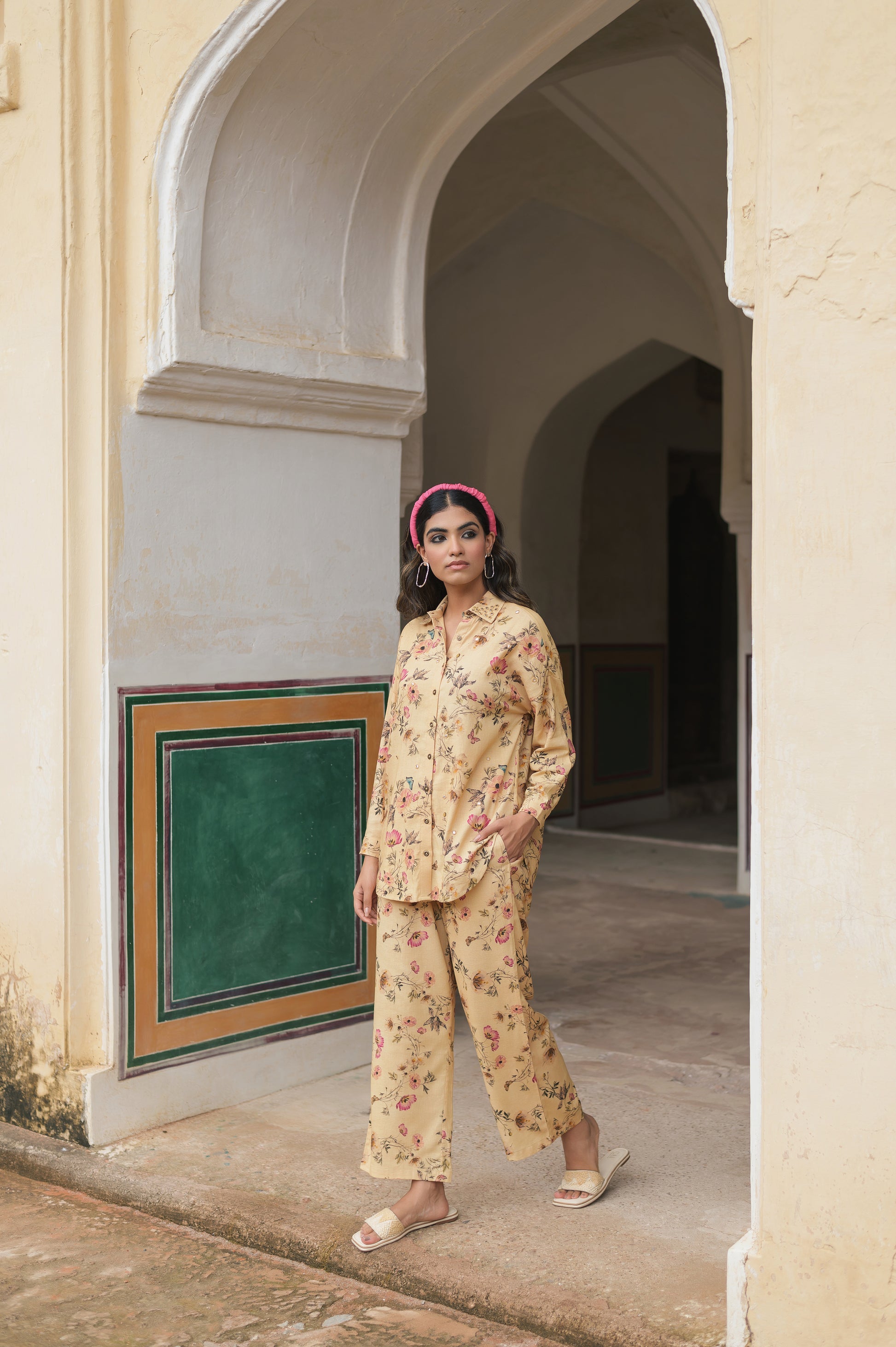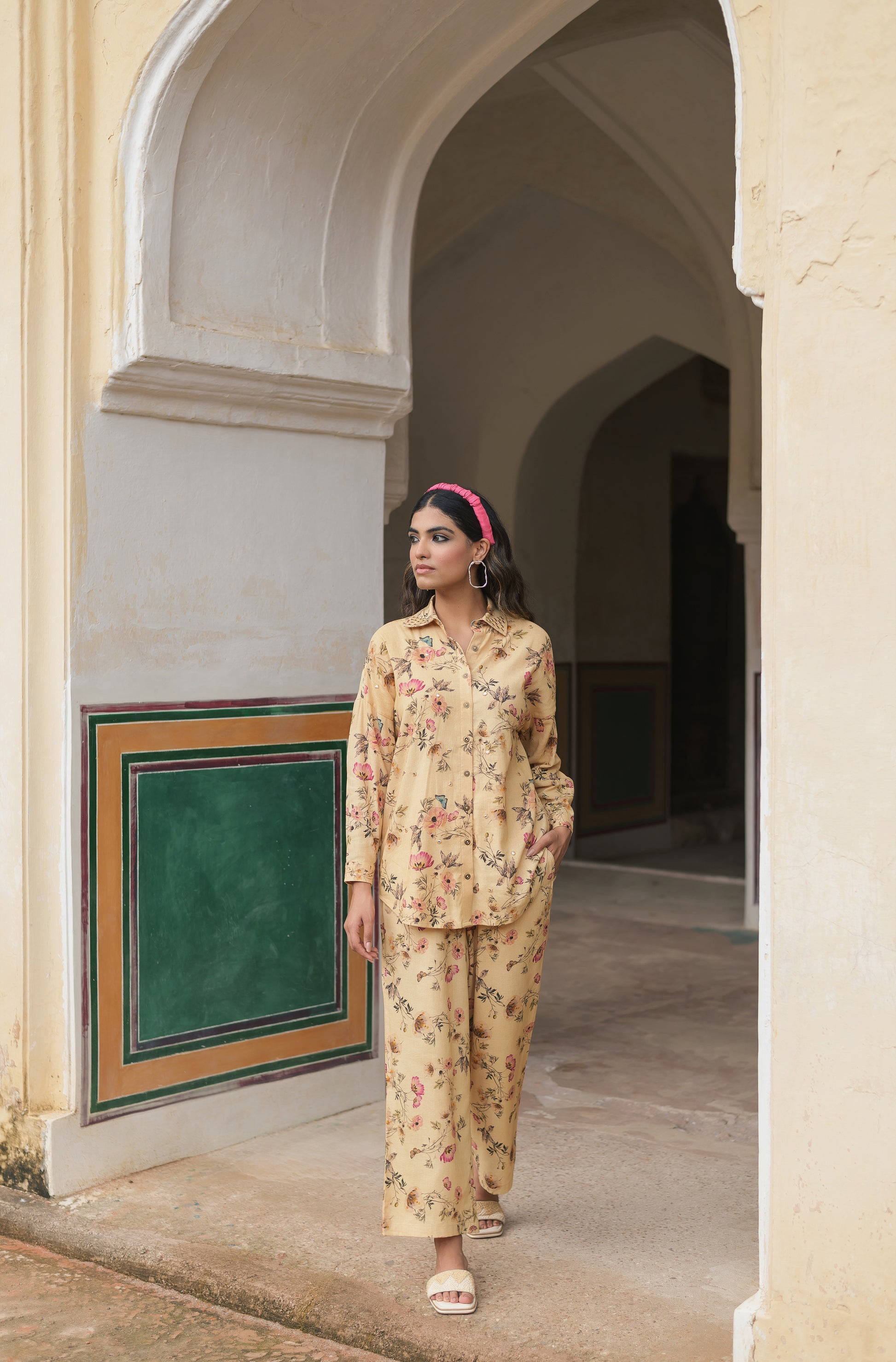 The Sand Set by Naav is a two-piece co-ord crafted in breathable cotton, designed in classic beige with a floral print. The collared button-down shirt features full sleeves and front buttons, paired with matching straight-fit pants for a relaxed yet polished look. It also features mirror embroidery on the front panels and collar. Comfortable and versatile, it transitions easily from day to evening wear.