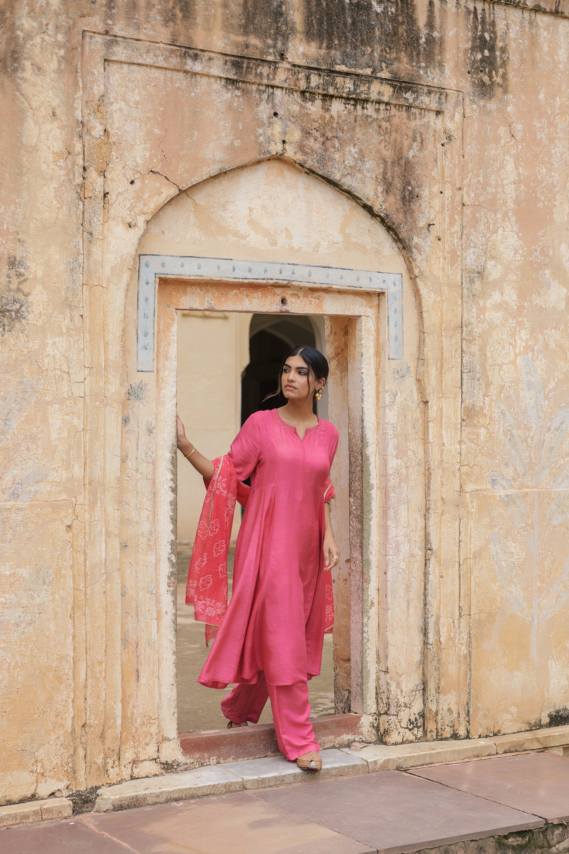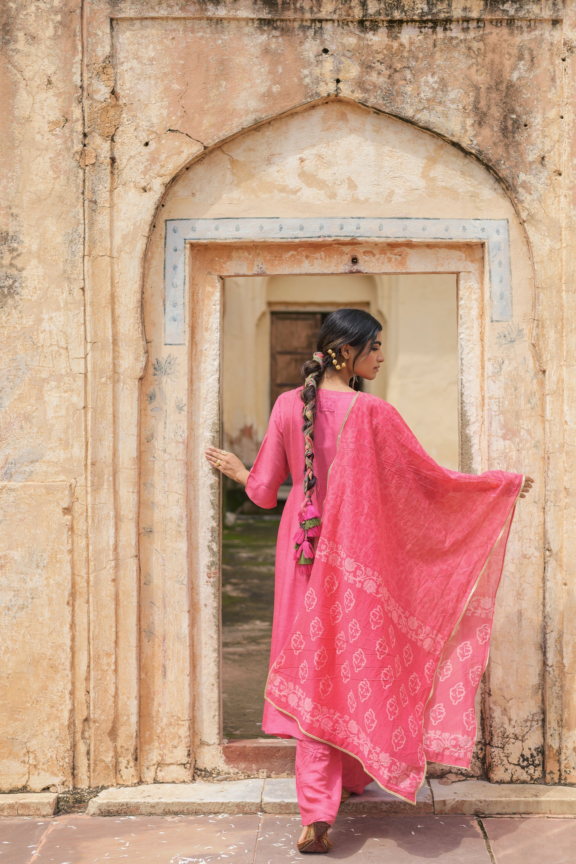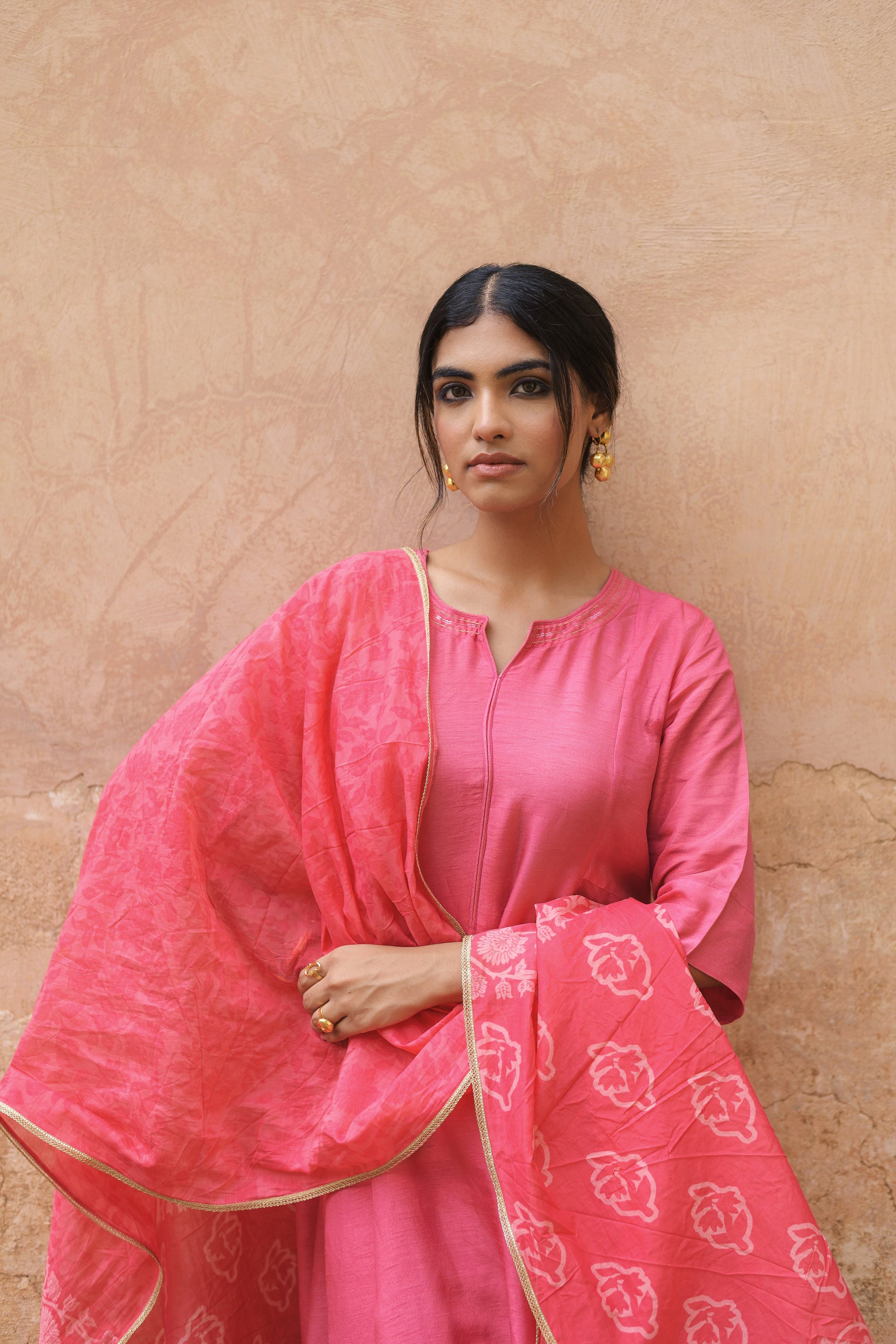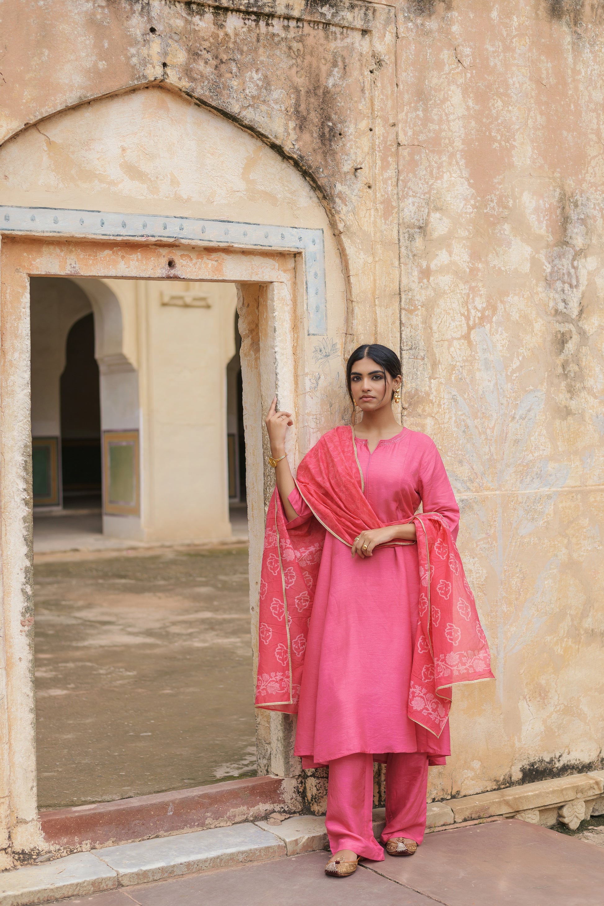 Anaar Set by Naav is a three-piece set in bright pink viscose silk, featuring a kali kurta, straight-fit pants, and a matching printed dupatta. The kurta is detailed with gold zari kantha and transparent sequin embroidery along the neckline. The printed dupatta is finished with a gold zari border for a festive touch.
