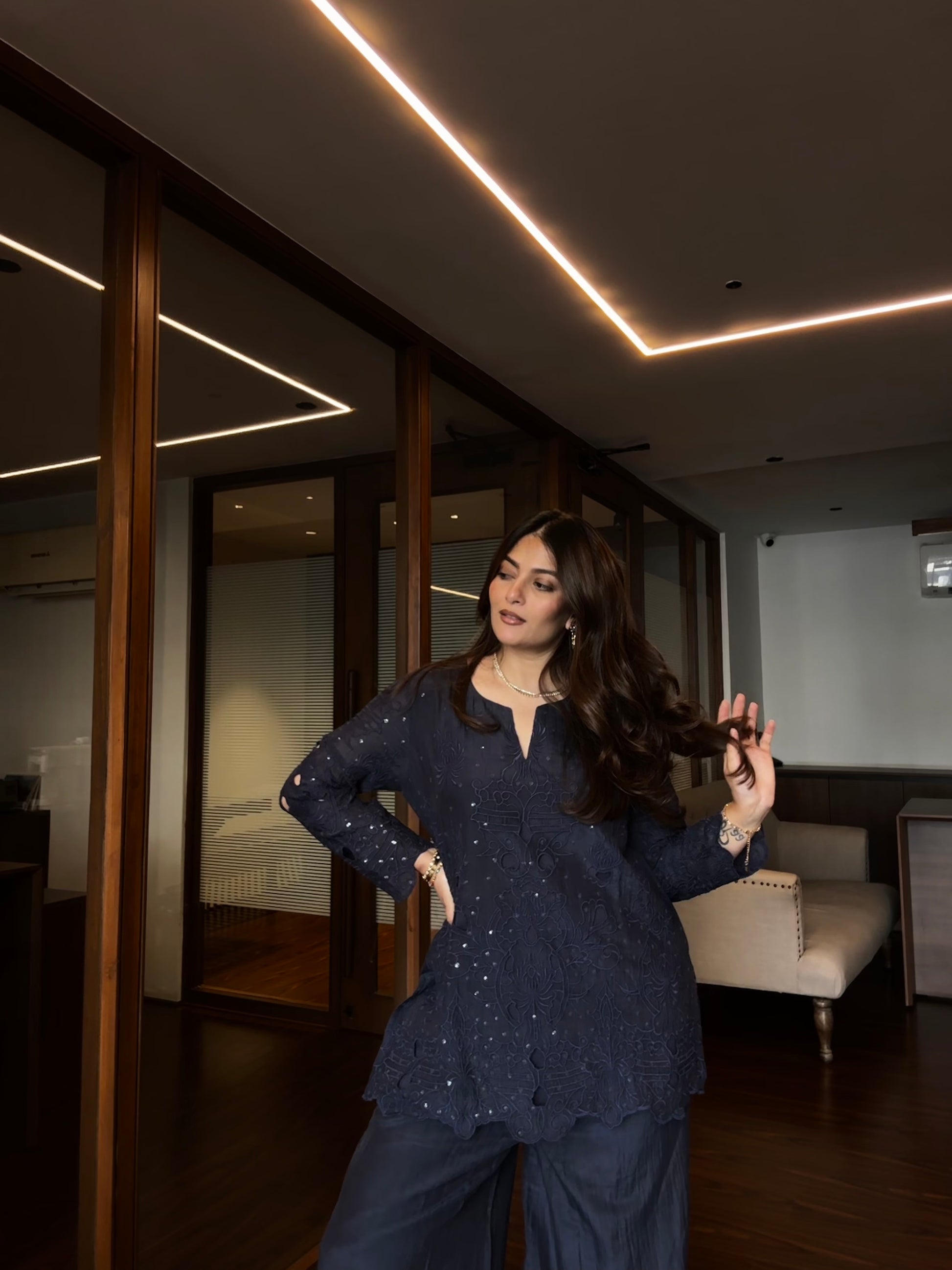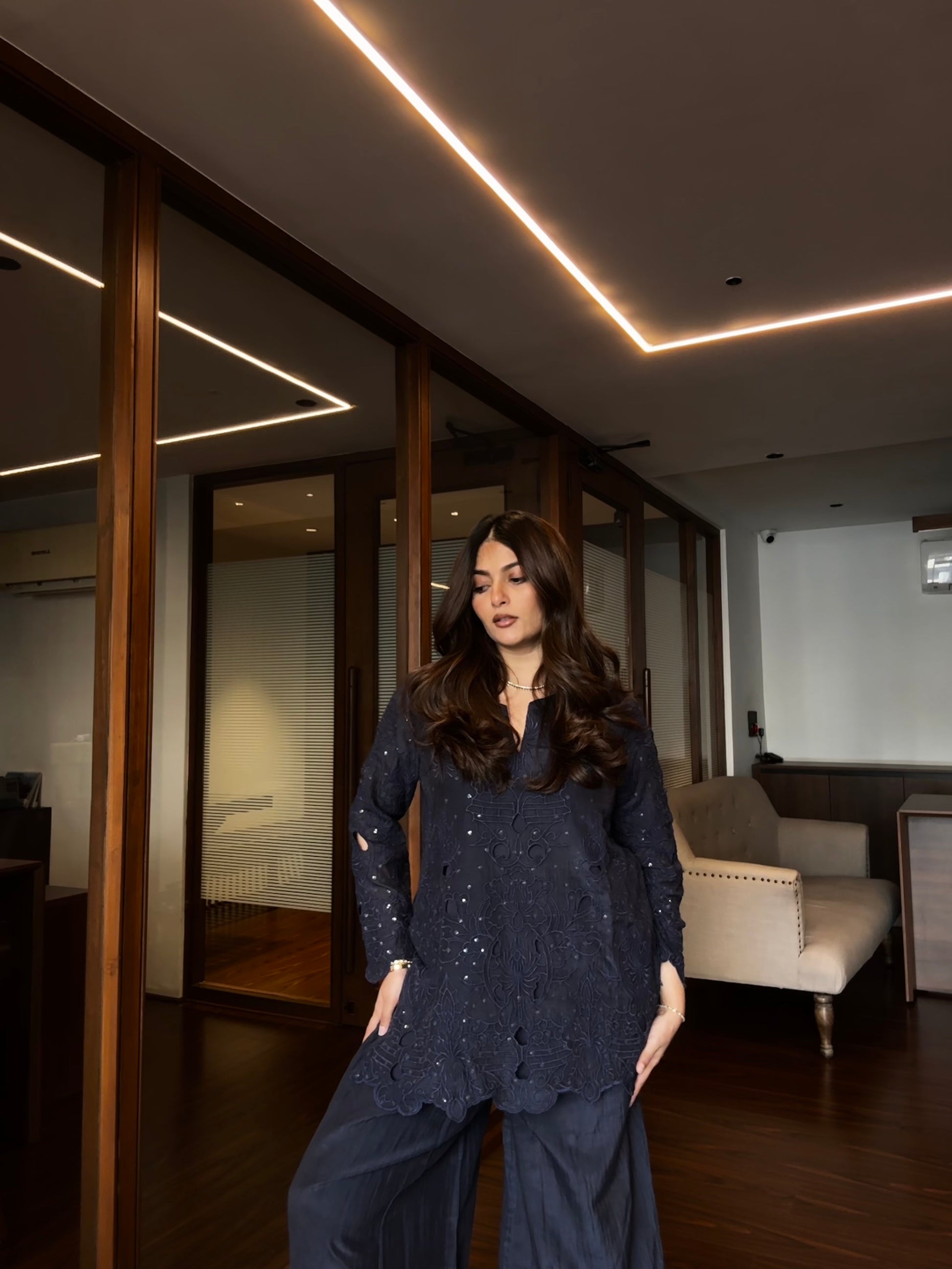 Details: Cutwork embroidery with transparent sequins, fully lined top, wide-leg pants with pockets