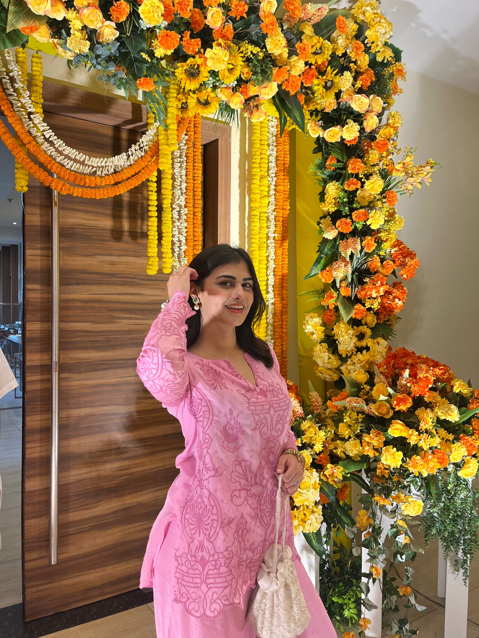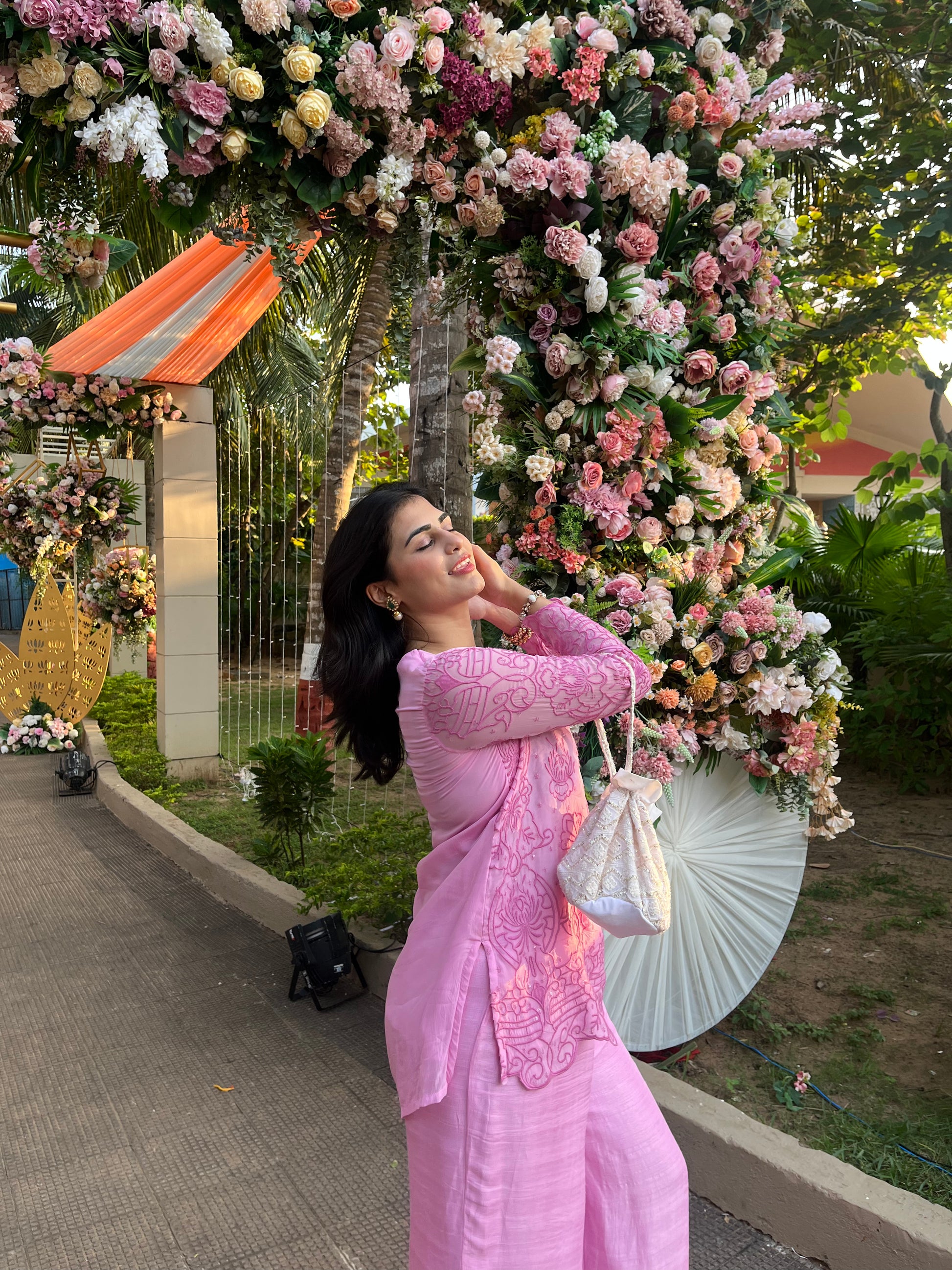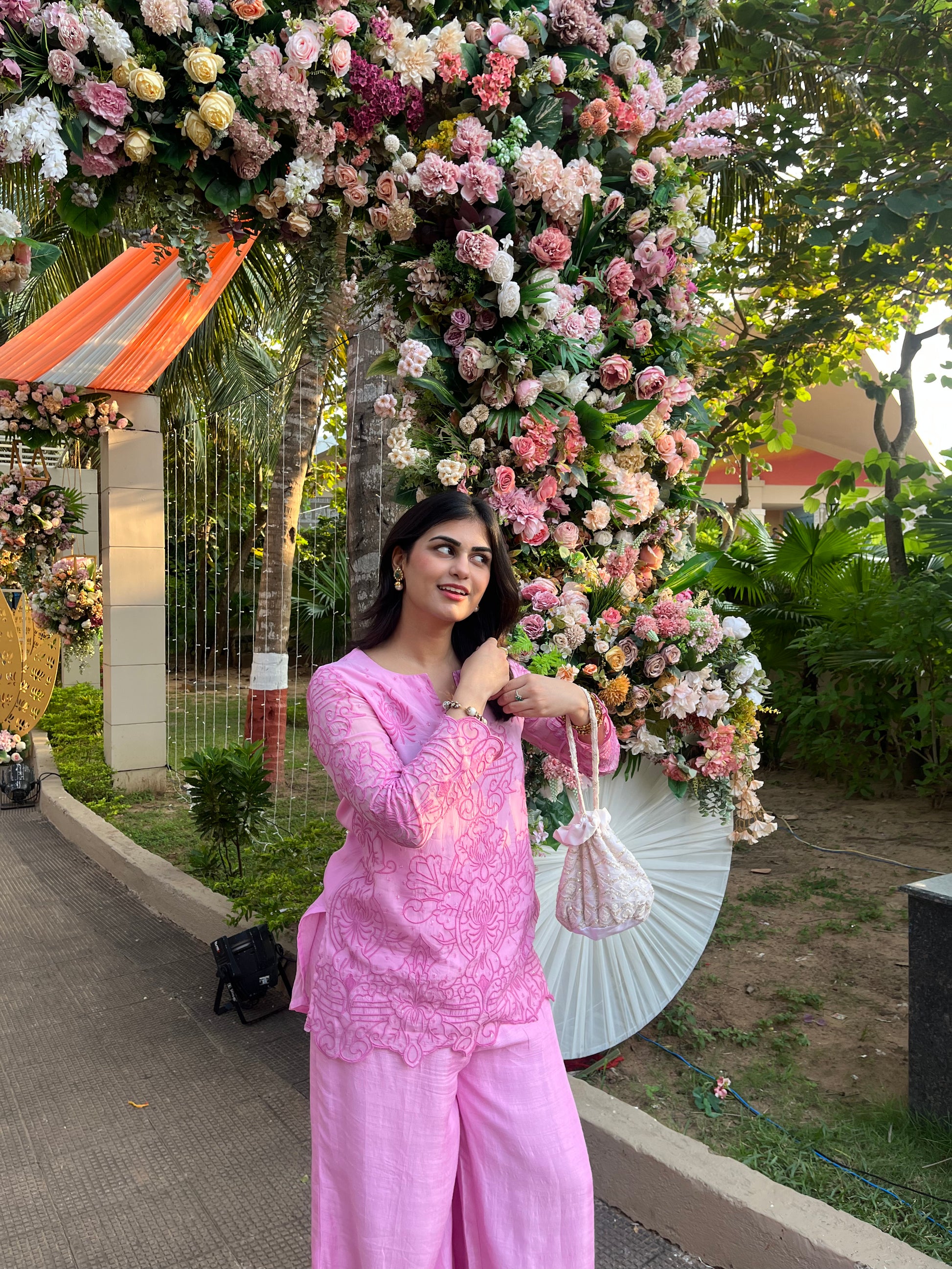 Fiza Set by Naav is a two-piece set featuring a fuchsia organza top paired with chanderi wide-leg pants. The top is detailed with cutwork embroidery highlighted with transparent sequins and is fully lined for comfort. The pants are designed with pockets for added ease.