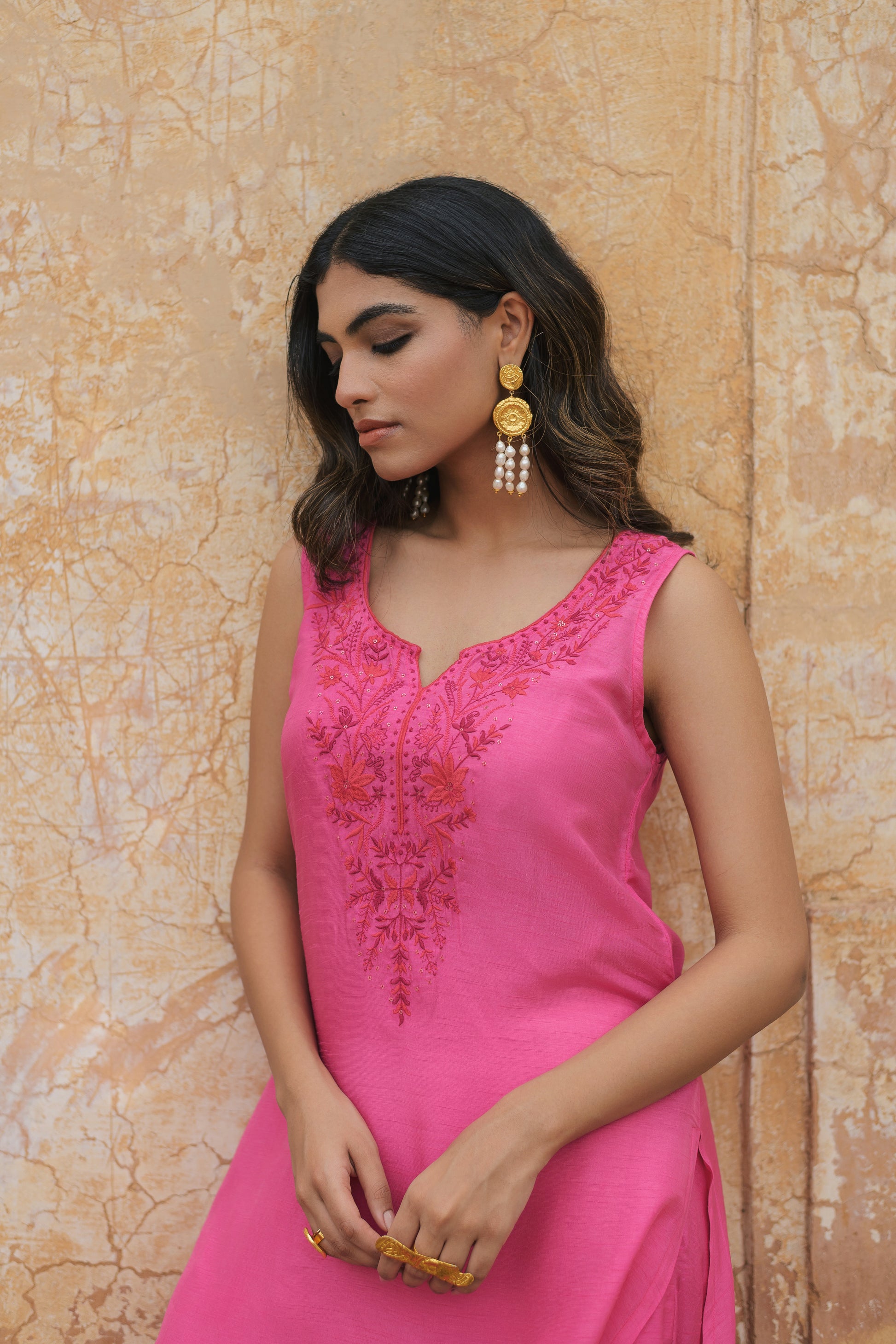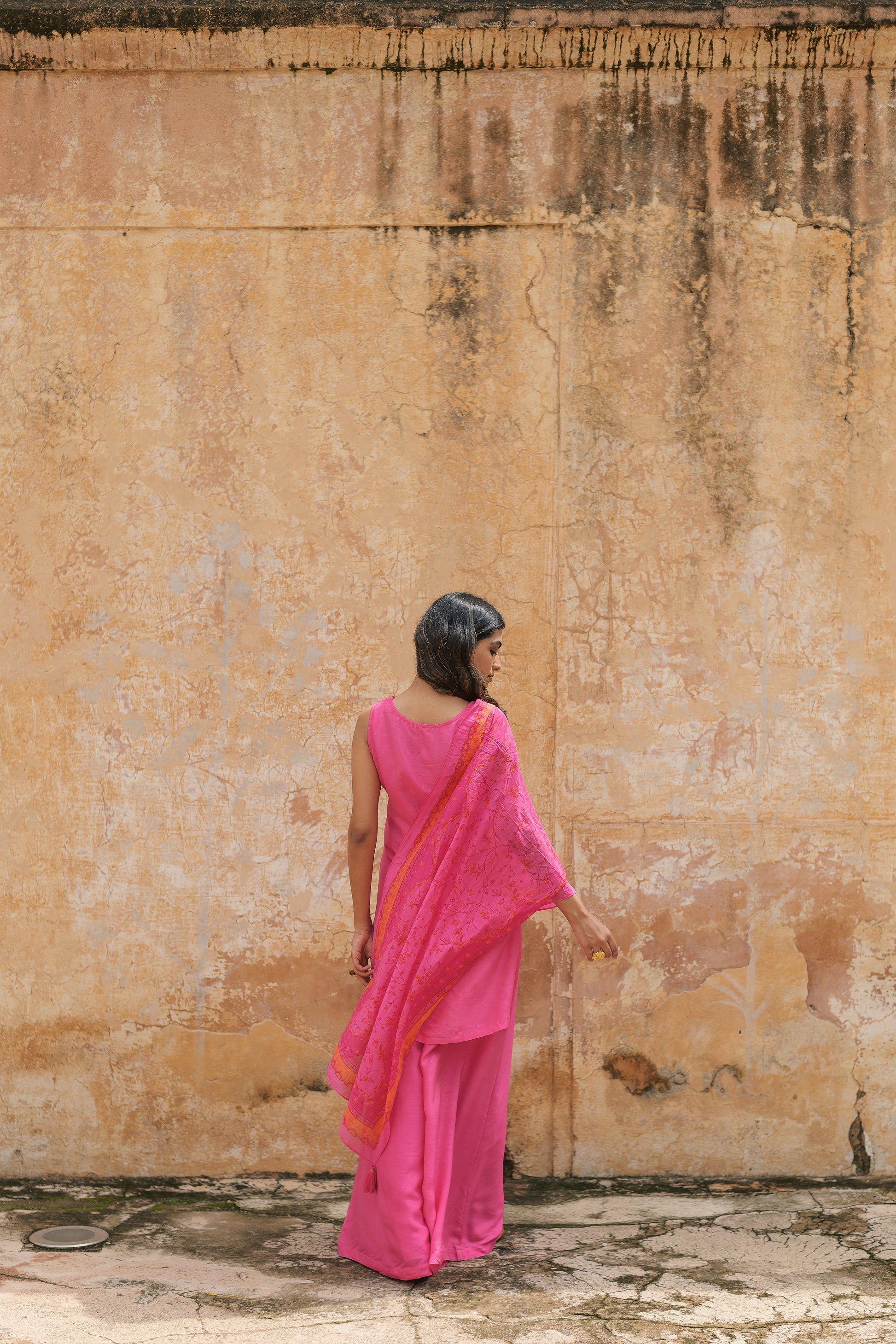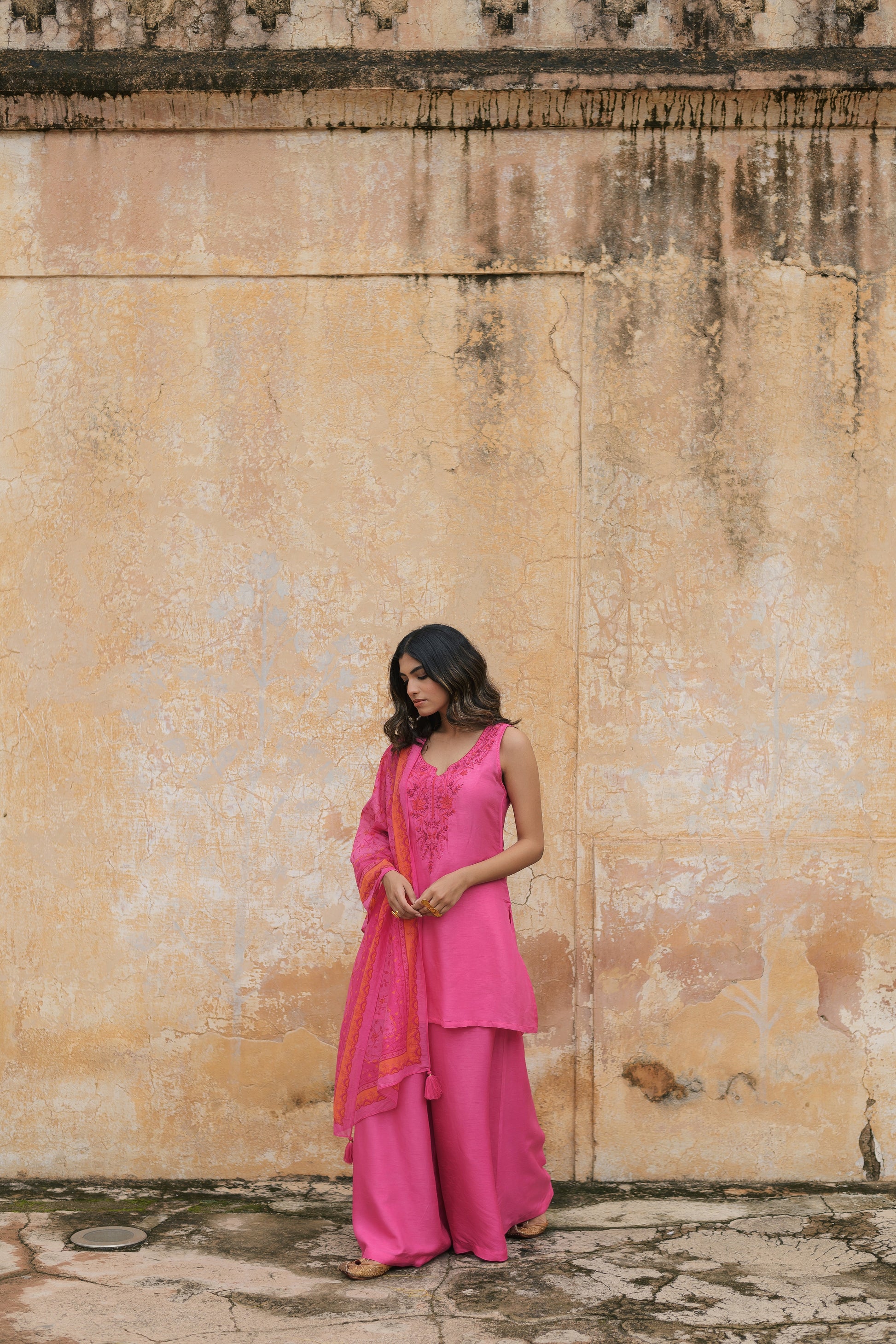 Hina Set by Naav is a three-piece set featuring a viscose silk sleeveless kurta, matching pants, and a printed cotton dupatta in fuchsia. The kurta is detailed with tonal embroidery on the yoke, adding subtle texture and charm.