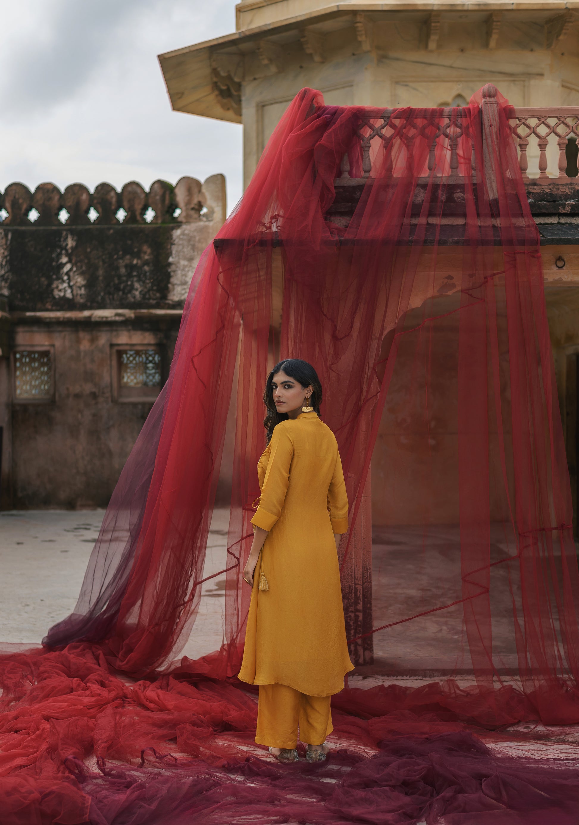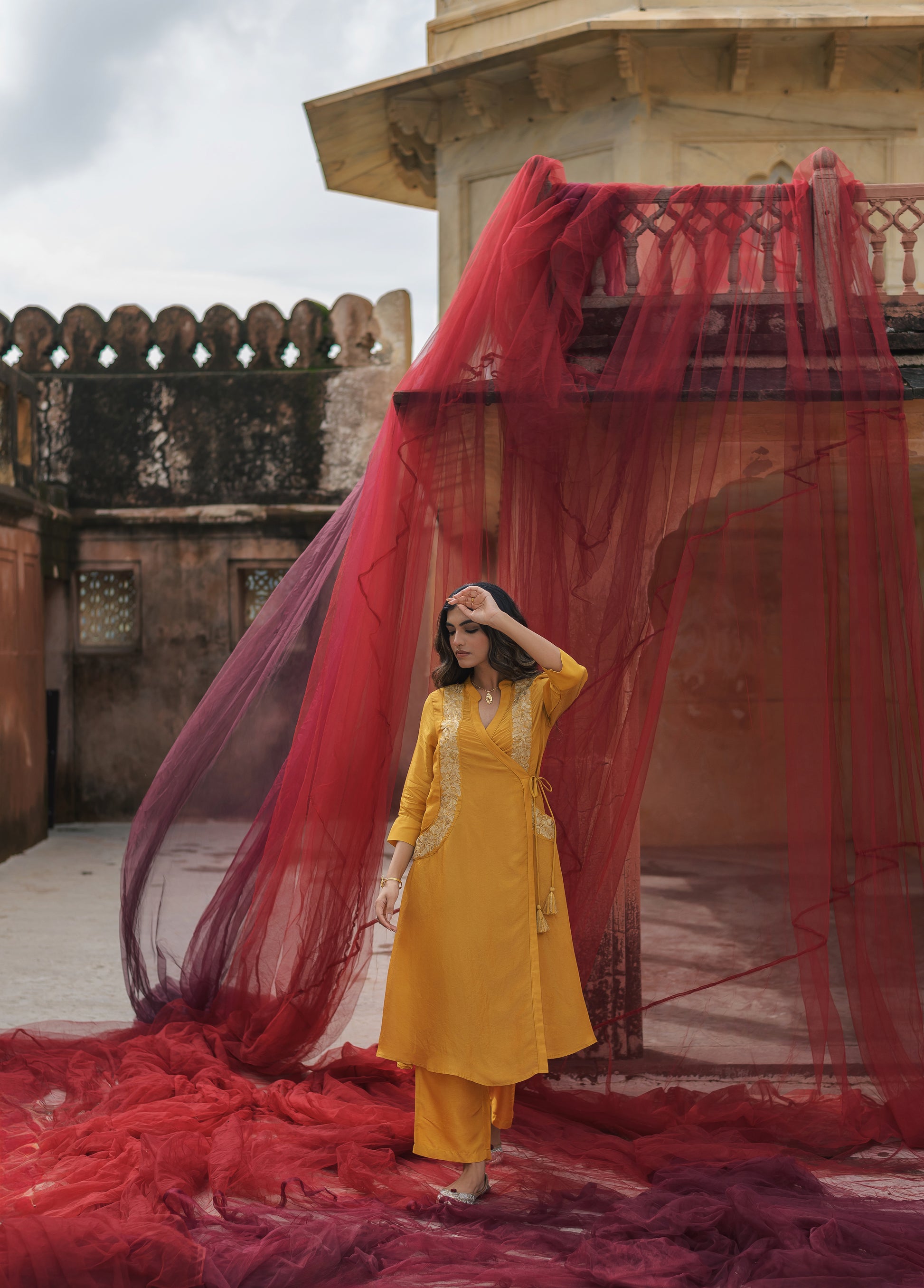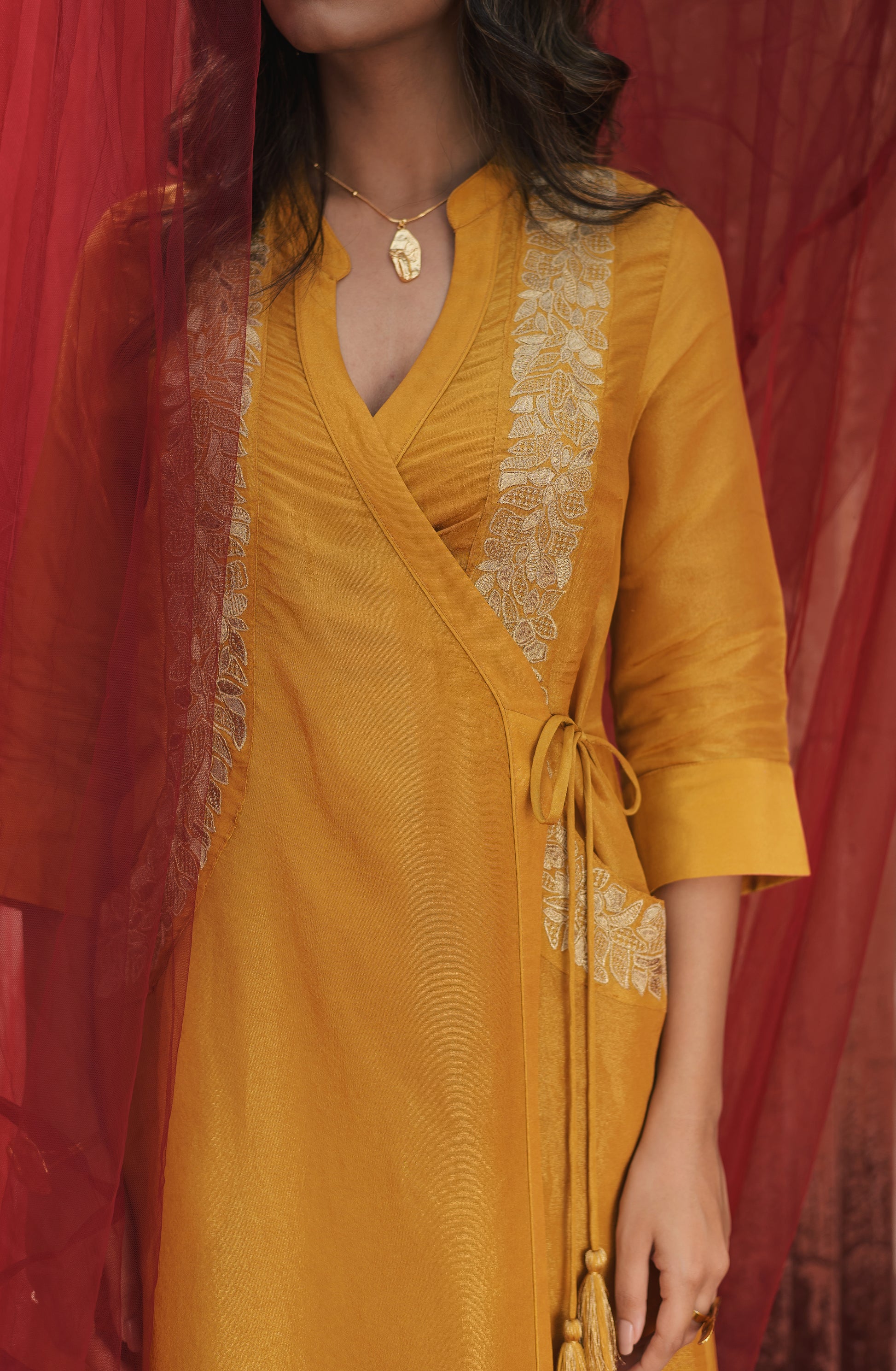 Saba Set by Naav is a three-piece set featuring an ochre tissue zari wrap kurta, a matching inner, and straight-fit viscose silk pants. The kurta is detailed with gold and silver zari embroidery and functional pockets, combining style with practicality.